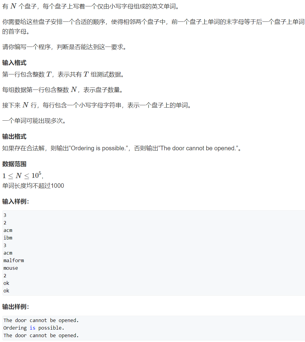 如果选取单词的首尾字母为点,每个单词为边,那么题目就会转化为有向图的欧拉路径问题