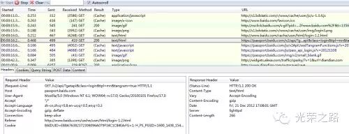 分析一下登录百度的过程,首先访问http://www.baidu.com,百度分配给你一个baiduid的cookie;点击“登录”按钮,浏览器会带着相关参数和cookie去请求nsclick.baidu.com;之后百度为了防止csrf攻击(csrf详细解析见:http://www.yeetrack.com/?p=220),会给客户端发送一个token;其后输入username、password,浏览器将用户名、密码、token及相关参数post给passport.baidu.com进行校验,校验成功后,百度会分配给浏览器cookie,这里用的到的有SAVEUSERID和BDUSS两个,上面过程可以通过firefox的插件httpfox轻松得到(关于firefox的插件httpfox,详细见http://www.yeetrack.com/post/2012-11-22/firefox%2520httpfox%25E6%258F%2592%25E4%25BB%25B6)