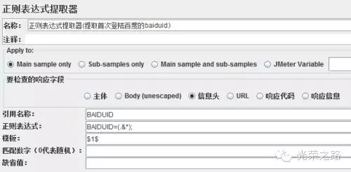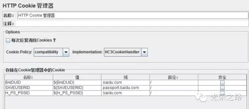 名称是cookie的key,要和http消息头中的名字对应;值是我们从正则表达式中提取的cookie value,${BAIDUID}是指取出BAIDUID这个变量的值(要和正则表达式页面的名字对应),下面两个是后面用到的。cookie的域和路径依次填好。