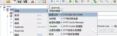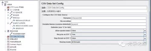 当然如果我们要搜索的关键词很多,也可以从外面的文件中读取,方法是:在线程组中添加一个csv data set config,这个组件专门用来读取外部的文本文件。