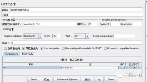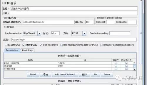6. 继续,我们点击了登录按钮,百度为了防止csrf攻击,会给我们一个token(这个token在我们提交密码时一起提交过去),我们要在jmeter中再新建一个http请求,来获取这个token,get方法。相应参数如图: