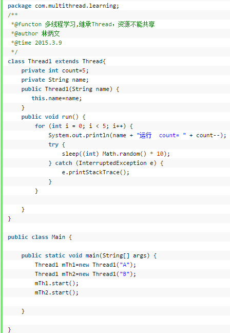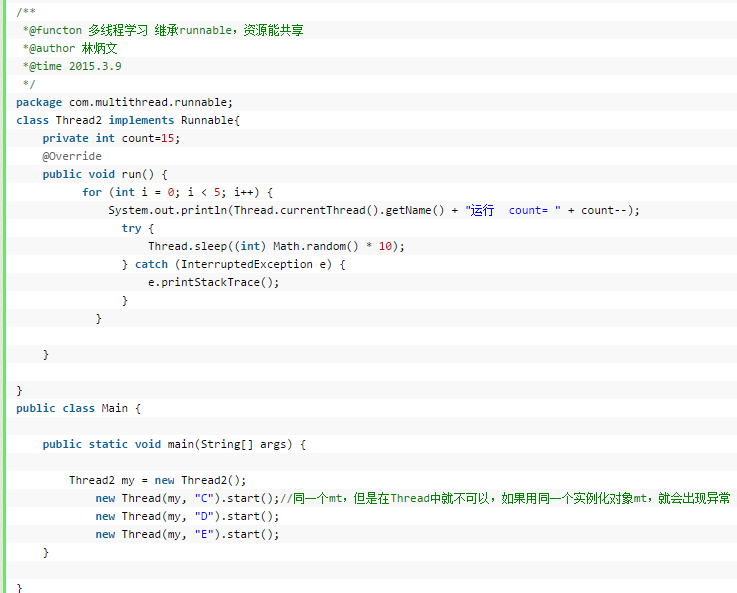 如果一个类继承Thread,则不适合资源共享。但是如果实现了Runable接口的话,则很容易的实现资源共享。