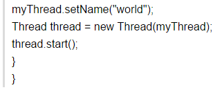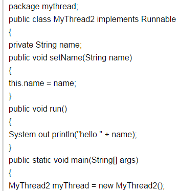 向对象中传入数据一般有两次机会,第一次机会是在建立对象时通过构造方法将数据传入,另外一次机会就是在类中定义一系列的public的方法或变量(也可称之为字段)。然后在建立完对象后,通过对象实例逐个赋值。下面的代码是对MyThread1类的改版,使用了一个setName方法来设置 name变量: