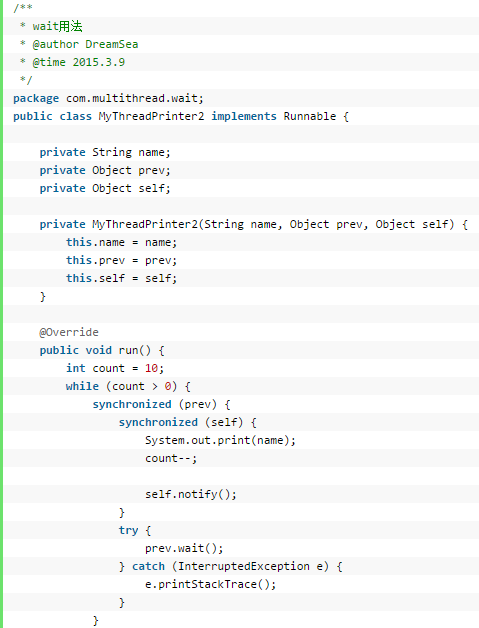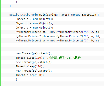 先来解释一下其整体思路,从大的方向上来讲,该问题为三线程间的同步唤醒操作,主要的目的就是ThreadA->ThreadB->ThreadC->ThreadA循环执行三个线程。为了控制线程执行的顺序,那么就必须要确定唤醒、等待的顺序,所以每一个线程必须同时持有两个对象锁,才能继续执行。一个对象锁是prev,就是前一个线程所持有的对象锁。还有一个就是自身对象锁。主要的思想就是,为了控制执行的顺序,必须要先持有prev锁,也就前一个线程要释放自身对象锁,再去申请自身对象锁,两者兼备时打印,之后首先调用self.notify()释放自身对象锁,唤醒下一个等待线程,再调用prev.wait()释放prev对象锁,终止当前线程,等待循环结束后再次被唤醒。运行上述代码,可以发现三个线程循环打印ABC,共10次。程序运行的主要过程就是A线程最先运行,持有C,A对象锁,后释放A,C锁,唤醒B。线程B等待A锁,再申请B锁,后打印B,再释放B,A锁,唤醒C,线程C等待B锁,再申请C锁,后打印C,再释放C,B锁,唤醒A。看起来似乎没什么问题,但如果你仔细想一下,就会发现有问题,就是初始条件,三个线程按照A,B,C的顺序来启动,按照前面的思考,A唤醒B,B唤醒C,C再唤醒A。但是这种假设依赖于JVM中线程调度、执行的顺序。