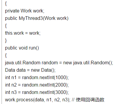 上面讨论的两种向线程中传递数据的方法是最常用的。但这两种方法都是main方法中主动将数据传入线程类的。这对于线程来说,是被动接收这些数据的。然而,在有些应用中需要在线程运行的过程中动态地获取数据,如在下面代码的run方法中产生了3个随机数,然后通过Work类的process方法求这三个随机数的和,并通过Data类的value将结果返回。从这个例子可以看出,在返回value之前,必须要得到三个随机数。也就是说,这个 value是无法事先就传入线程类的。