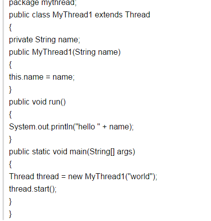 在创建线程时,必须要建立一个Thread类的或其子类的实例。因此,我们不难想到在调用start方法之前通过线程类的构造方法将数据传入线程。并将传入的数据使用类变量保存起来,以便线程使用(其实就是在run方法中使用)。下面的代码演示了如何通过构造方法来传递数据:
