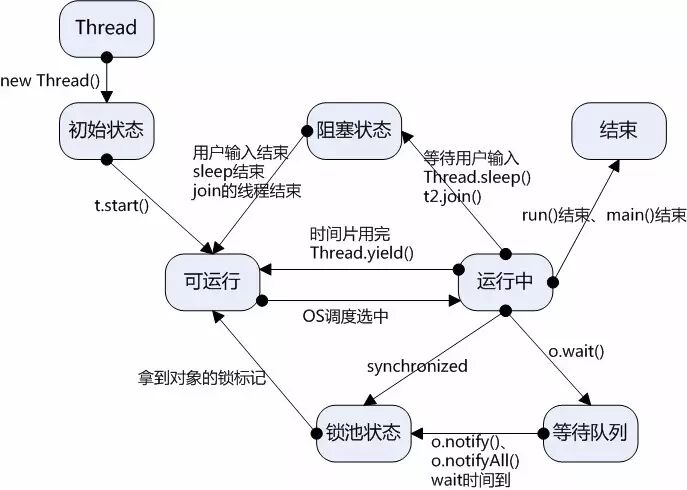 (三)、其他阻塞:运行的线程执行sleep()或join()方法,或者发出了I/O请求时,JVM会把该线程置为阻塞状态。当sleep()状态超时、join()等待线程终止或者超时、或者I/O处理完毕时,线程重新转入就绪状态。