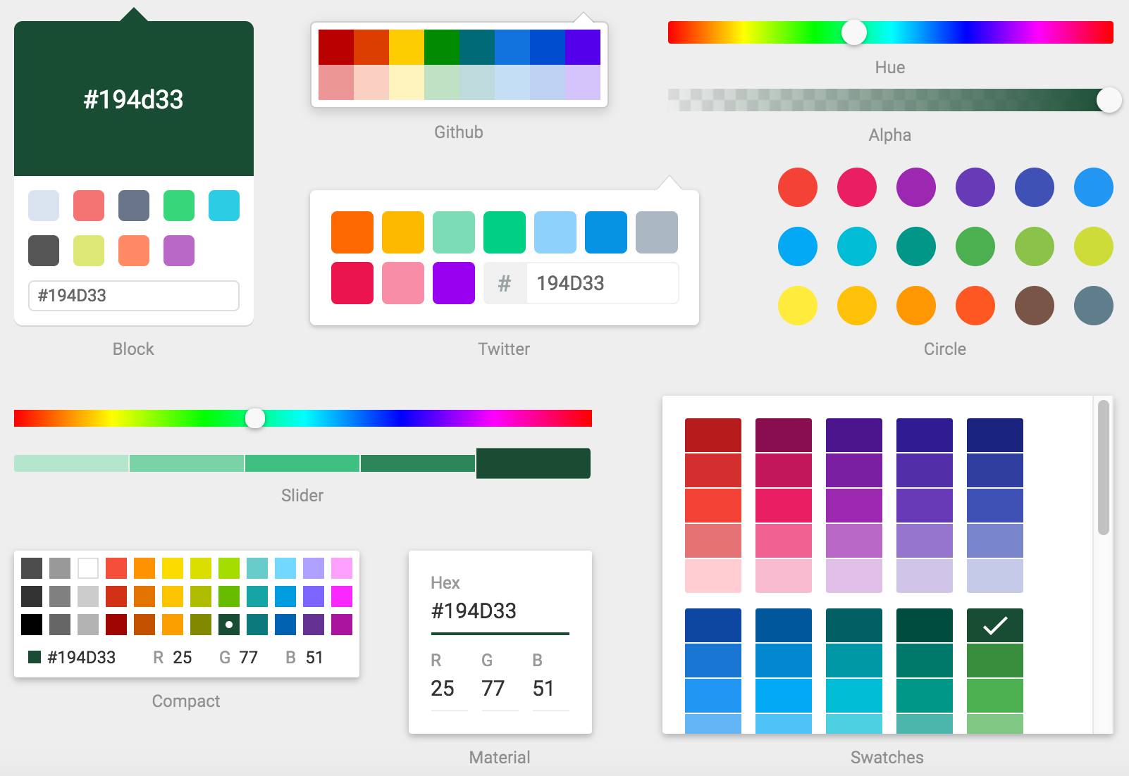 Sketch、Photoshop、Chrome、Github、Twitter、Material Design 等多种颜色选择器合集,包含 13 种不同的选择器,也可以使用提供的标准组件来创建自己的组件。