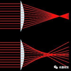 我们通常看到的透镜成像的简化图中,平行光通过透镜以后汇聚于一点,这点叫做焦点,其实真实的情况并非如此。如下图所示: