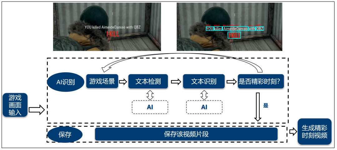 譬如在 FPS 游戏中,当游戏玩家击杀某人时,游戏画面会同步显 示“A 杀死 B”这样的关键信息,通过引 入 AI 字符识别技术,能够实时捕捉游戏画面的文字信息,判断关键信息的出现时刻,从而记录这些精彩片段。