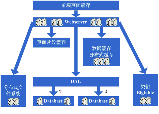 突然有一天,发现这个完美的时代也要结束了,数据库的噩梦又一次出现在眼前了。由于添加的webserver太多了,导致数据库连接的资源还是不够用,而这个时候又已经分库分表了,开始分析数据库的压力状况,可能会发现数据库的读写比很高,这个时候通常会想到数据读写分离的方案。当然,这个方案要实现并不容易,另外,可能会发现一些数据存储在数据库上有些浪费,或者说过于占用数据库资源,因此在这个阶段可能会形成的架构演变是实现数据读写分离,同时编写一些更为廉价的存储方案,例如BigTable这种。