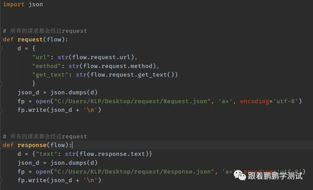 这边鹏鹏想把抓取到的内容保存到JSON文件里所以这里需要导入一个JSON的包,这段代码需要注意的一个地方就是,在运行这段代码之前一定要新建两个空的JSON文件用来保存请求内容和响应内容。