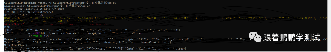 我们看到整段代码有两个模块。这两个模块在Python中称之为函数,也可以叫做方法。def request(flow): 在这里面request是函数名,你可以自己设置,但是我们在写mitmdump相关脚本的时候为了更好的辨认,所有我们统一把请求部分的代码命名成request,把响应部分的代码命名为response。括号里(flow)是一个参数。当我们运行mitmdump的时候,每次请求会通过flow传入我们写的函数。这时候我们就可以看到结果啦!