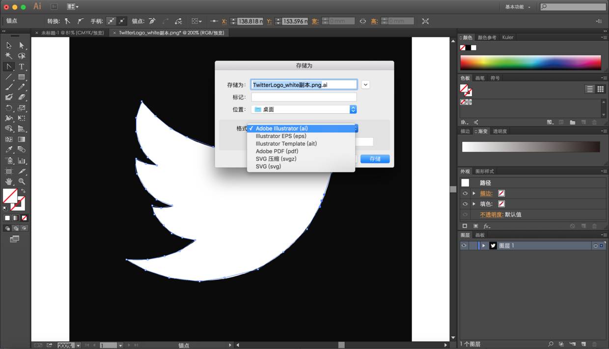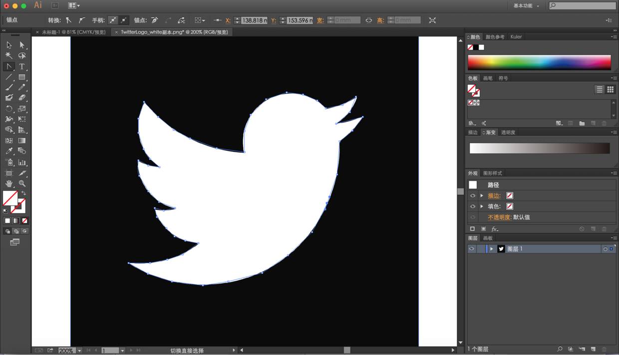 其实这里有一个小插曲,绘制路径的时候,其实我用的是 AI 描点的,之后导出 SVG 给 PaintCode,居然不识别我的路径。后来网上问了问,大神要我换 Sketch 试试,然后就行了。后来我比较了一下 Sketch 和 AI 导出的 SVG 有什么不同,才发现,我之前 AI 导出的,加了几个图层,把路径盖住了。用 AI 绘制路径的方法和 Sketch 的差不多,如下图。