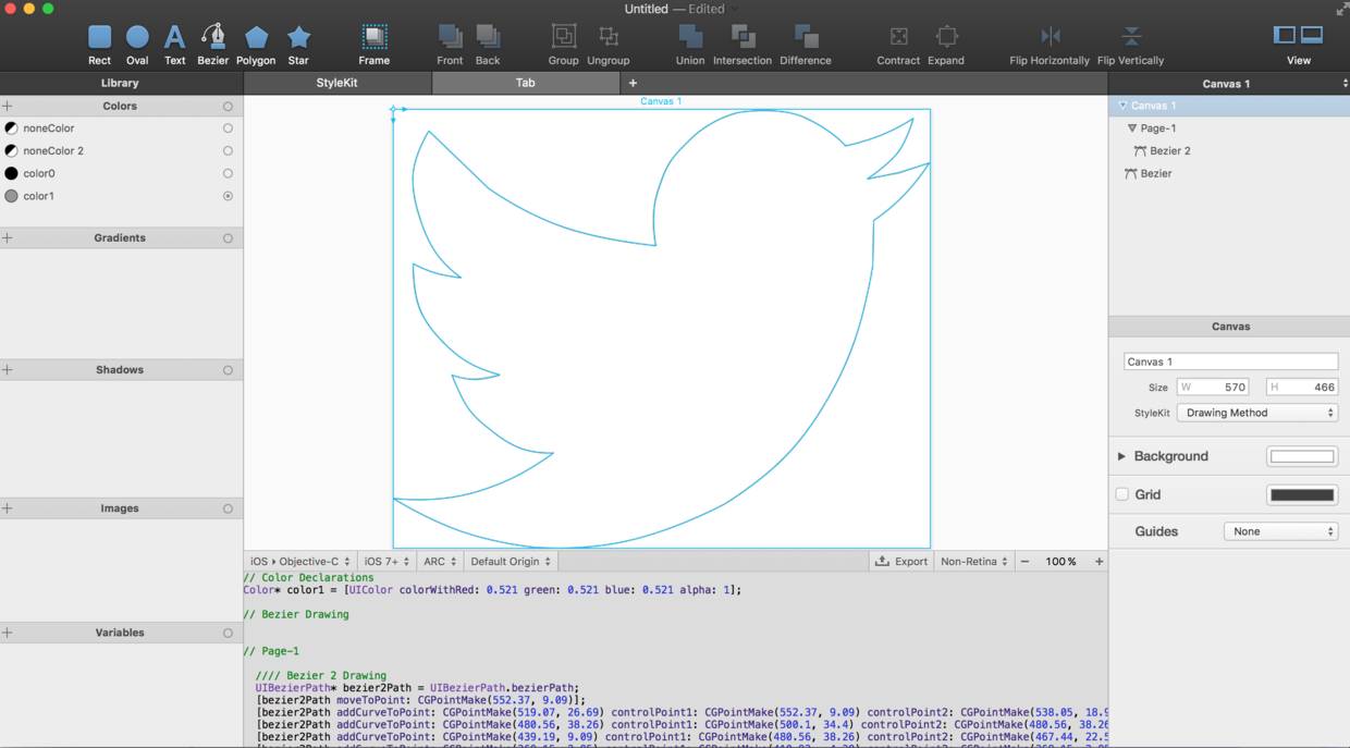 也就是说只用一个 PaintCode 就可以完成所有想做的事情了,不需要 Sketch 或者 AI 去画路径了。PaintCode 自己就可以画路径,导出 OC 或者 Swift 代码了。