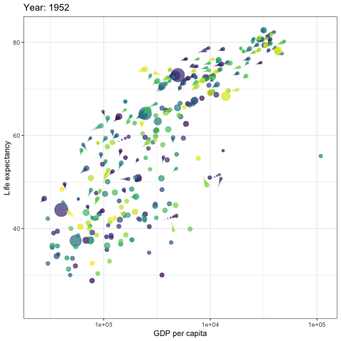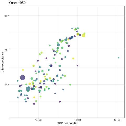 下面尝试使用 gganimate 包和 gapminder 数据集,实现类似可视化过程。