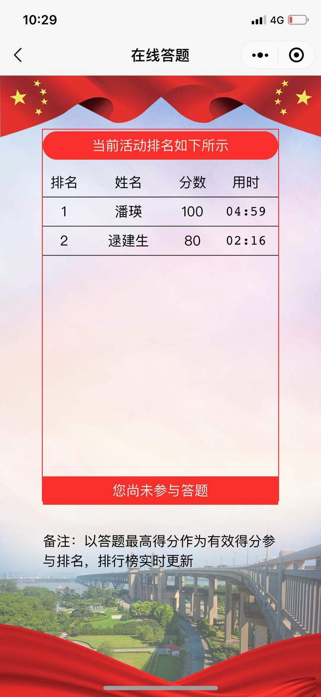 该答题小程序从12月20号早上8点开始,持续时间为10天,每人可参与3次答题,取最高得分为有效得分,参与排名。