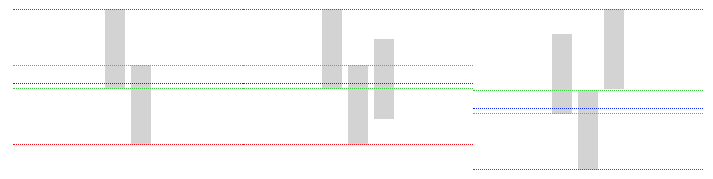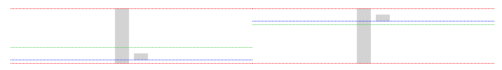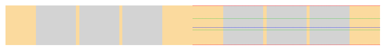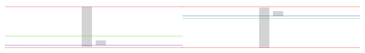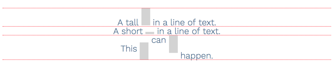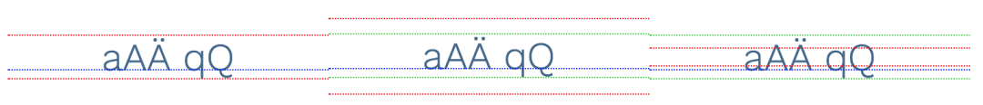 这里有三行文本紧挨着。红线表示行高的顶边和底边,绿线表示字体高度,蓝线表示基线。左边这一行,行高与字体高度相同,因此上下方的红色和绿线重叠在了一起。中间一行,行高是font-size的两倍。右边一行,行高为font-size的一半。