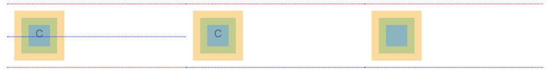 从左到右:包含流内内容(“c”)的行内块、包含流内内容且设置了溢出(overflow: hidden)的行内块和未包含流内内容(但内容区有高度)的行内块。红线表示外边距的边界,黄色是边框,绿色的内边距,蓝色是内容区,蓝线是每个行内块元素的基线。