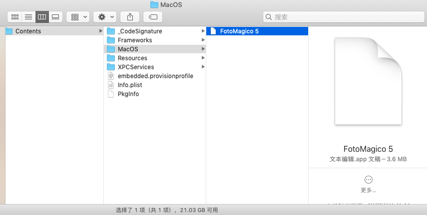 找到对应文件夹下的文件,比如说截图中显示的 FotoMagico 5,如果权限正确的话,该文件应该是一个 Unix 可执行的文件,而不是现在这种类型不明的文件。