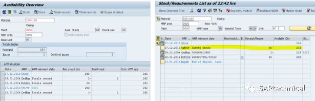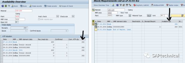 CO09实际上以263开头,你可以在Rec./reqd qty栏中看到,ATP的数量由于保留1而立即减少。它不包括质量检验库存。