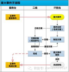 重大事件处理:当IT服务事件重复度达到十次或者异常报警持续一段时间未解除的都会升级为重大事件,需要IT 担当组织人员找到解决方案;