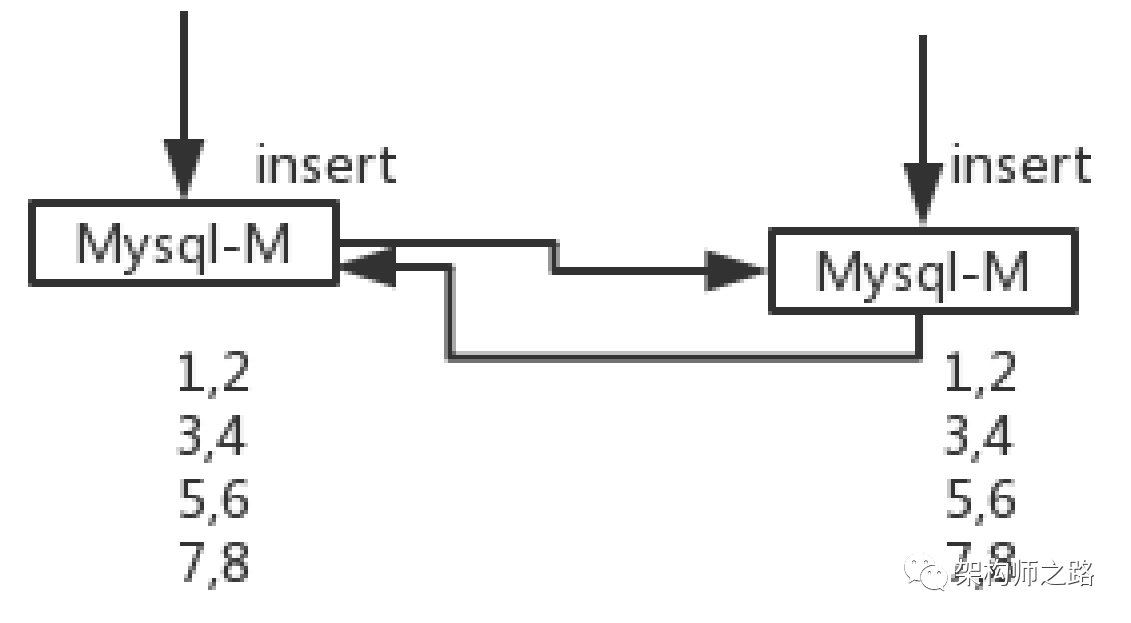 库1中插入数据主键为1/3/5/7,库2中插入数据主键为2/4/6/8,不冲突
