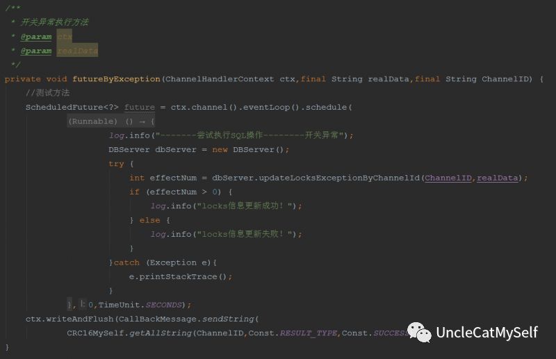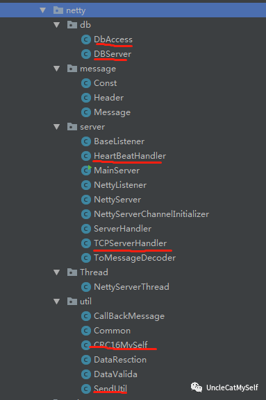 以上是真实项目的netty包下的目录截图,一些基本工具类是为了解密与双向通信发送的实现,由于单片机使用TCP,所以我们要自定义一个TCP的Handler,加入Netty的handler链中,心跳机制就多说了,主要还有Db层,这是用于在接收到数据,立即进行数据库的读写操作,由于项目本身使用MyBatis作为数据的持久层,但是在Handler中并不能很好的处理,所以我使用了原生的数据库连接,并在数据通信的不同类型中,使用线程来执行数据库操作。