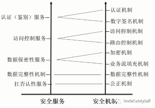 如果把网络通信视为Y轴,那么对应的安全机制就是X轴,分别是:加密机制、数字签名机制、访问控制机制、数据完整性机制、认证机制、业务流填充机制、路由控制机制、公证机制