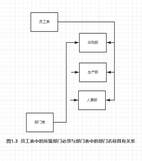 人事部门还会创建一张部门表,部门表中包含了部门的名称、部门的位置部门的编号等信息,人员表的所属部门应该是要与部门表中的部门名称保持一致,否则数据库中的数据库就会出现混乱,如图1.3所示。