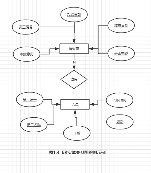 由图1.4可以发现,人员和请假单这两个实体使用矩形表示,实体的属性使用椭圆形表示,实体与实体之间的关系使用另行表示。人员实体与请假单实体居勇1对多的关系,因此在另行附近使用1和N表示。