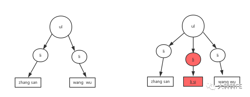 上文中提到视图是数据的表现,当数据改变时可以清空所有的dom节点然后重新渲染视图,缺点是可能造成了很大的浪费,因为大部分的dom节点可能并没有变,比如渲染一个列表,可能只是插入了一条数据: