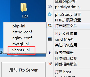 打开PHPStudy设置,通过“打开配置文件”,打开vhosts-ini.con这个文件,打开,找到如下代码: