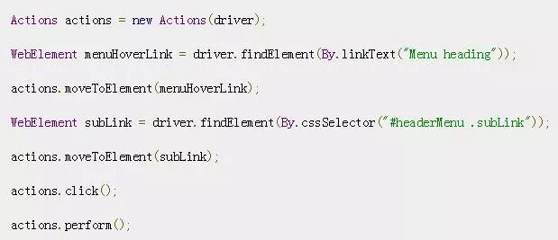 应该首先移动菜单标题,然后移至弹出菜单项并单击它。不要忘记在最后调用actions.perform() 。以下是一些示例Java代码: