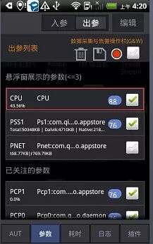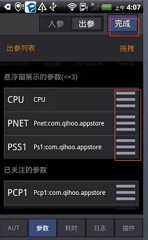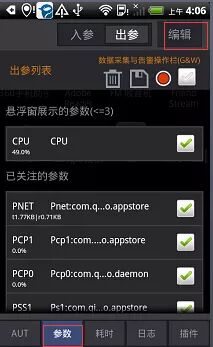6.进入参数标签,点击编辑,拖拽要时时监控的性能指标到悬浮窗展示的参数这,如要监控cup(cpu)、内存(pss)、流量(pnet)(以后在运行目标app时可实时看到这些参数变化)