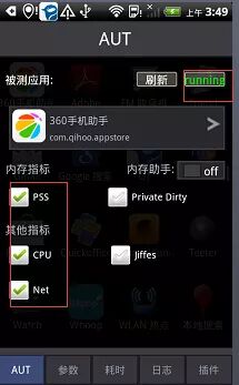 5.选择关注的测试点,cup、net(流量)、内存(pss)等,如果没有启动可以,点击lunch进行启动,这里应用已经在运行了。
