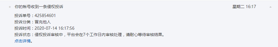 正当我沉浸在看错了的理想状态时,突然公众号官方给我发来一条消息。称:那篇文章侵权了,我还纳闷明明是自己写的,怎能侵权。点开投诉详情,恍然大悟,原来那篇文章里面有两个视频剪辑的软件,会声会影和Camtasia,由于人家是收费的,而我分享了个破解版,故引发了该软件代理商的投诉。