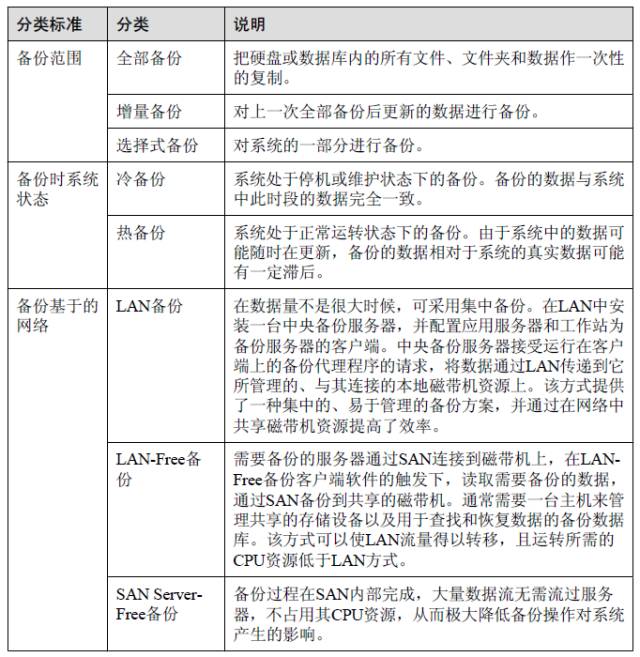 备份是指为防止系统出现操作失误或系统故障导致数据丢失,而将文件系统或数据库系统中的全部或部分数据集合从应用主机的硬盘或阵列复制到其它存储介质,