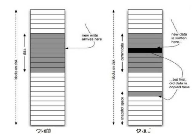 块覆盖原始卷。写时复制,因此而得名。但是这种方式有一个很明显的缺点,就是会降低原始卷的写性能,因此每次写入,都需要先备份原始数据到快照区。