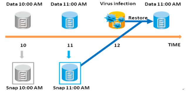 发现病毒感染等问题以后,利用最新的快照对数据进行restore(回滚),大多数情况下,整个恢复过程可以在几秒内完成。
