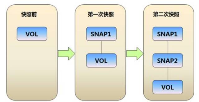 快照后的写操作会进行重定向,所有的写IO都被重定向到新卷中。所有旧数据均保留在只读的源卷中。这样做的好处是每次生成的快照文件都是放在连续的存储区域,