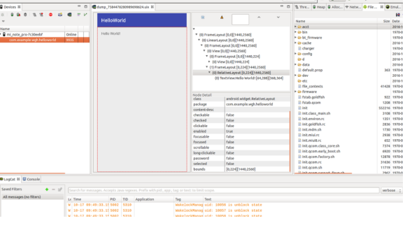 Dump View:显示手机当前屏幕对应当前调试页面,选择页面元素,会在右面就是显示对应View的信息,这对我们分析页面布局很有用。