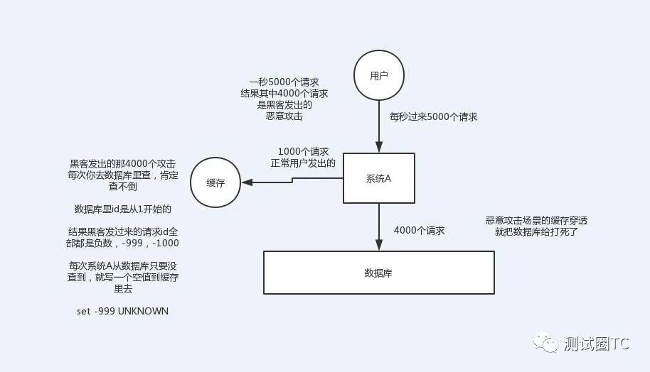 如果被测系统使用了缓存,那么我们不妨加个常规的测试用例,那就是如果在请求中构造一些不存在的key,看看系统的表现。正常预期应该是请求不会直接穿透到db层。