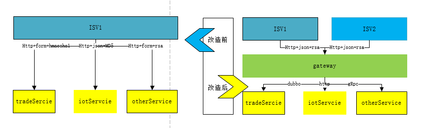 笔者所在的公司对外提供了一些开放能力给第三方ISV,比如设备管控、统一支付、对账单下载等能力,由于分属于不同的团队,所以对外提供的接口形式各异,初期还好,接口不多,ISV也能接受,但是后期接口多了ISV就开始抱怨接入成本太高,为了解决这一问题,我们在开放接口前面加了一层前端控制器GatewayController,其实就是我们后来开放平台的雏形,GatewayController对外统一暴露一个接口gateway.do,将对外接口的请求参数和响应参数统一在GatewayController做收敛,GatewayController往后端服务路由时也采用统一接口,改造前后对比如下图: