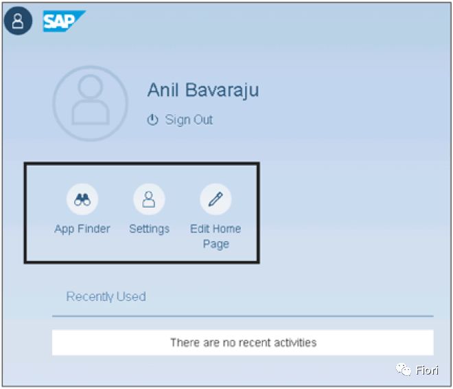 搜索按钮⑥,是另外一个SAP Fiori Launchpad的重要功能,使用此功能,用户可以查看最近的搜索,最近使用的应用,并搜索任意应用。并且客户可以通过它直接打开Fact sheet app。比如,用户可以直接通过Fiori launchpad搜索销售订单号,然后直接打开销售订单的fact sheet app查看信息。第五章,我们会讨论如何实施fact sheet app的搜索功能。