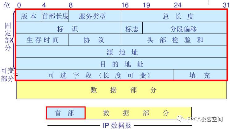 互联网把它最基本的传输单元称为数据报,与物理网络帧类似,数据报分为首部和数据区,如下图: