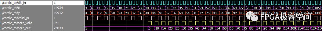 上图是使用控制器的方式实现CORDIC算法,可以看到每个输出都需要等待16个时钟周期,时效性比流水线方式低很多,适用于不需要实时输出的场景。