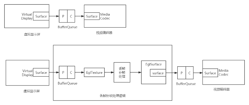 我们通过创建一个EglSurface对丢帧补帧进行处理,通过时间间隔控制eglTexture绘入EglSurface的频度进行丢帧,通过重复绘入最后一帧数据进行补帧。