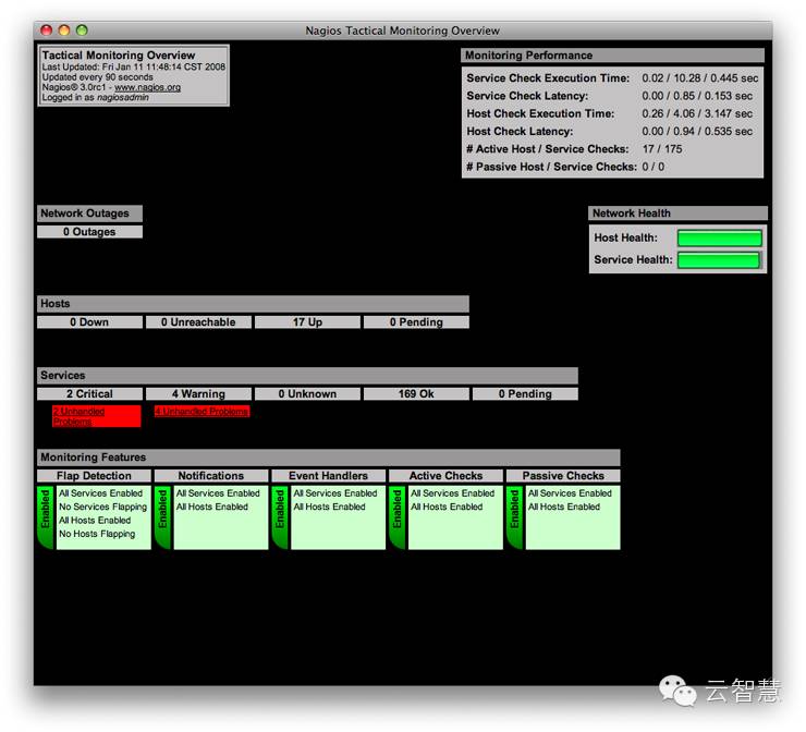 Nagios最大的特点是其强大的管理中心,尽管其功能是监控服务和主机的,但Nagios自身并不包括这部分功能代码,所有的监控、告警功能都是由相关插件完成的。