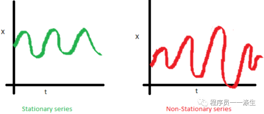 3、t时间段的序列和前一个时间段的序列的协方差(协方差,衡量的是两个变量在一段时间内同向变化的程度)应该只和时间间隔有关,而与时间t无关,在时间序列中,因为是同一个变量在不同时间段的值序列,所以这里的协方差称为自协方差。右图随着时间的增加,有一段变得越来越紧密了。所以右图的序列的协方差不是常数。